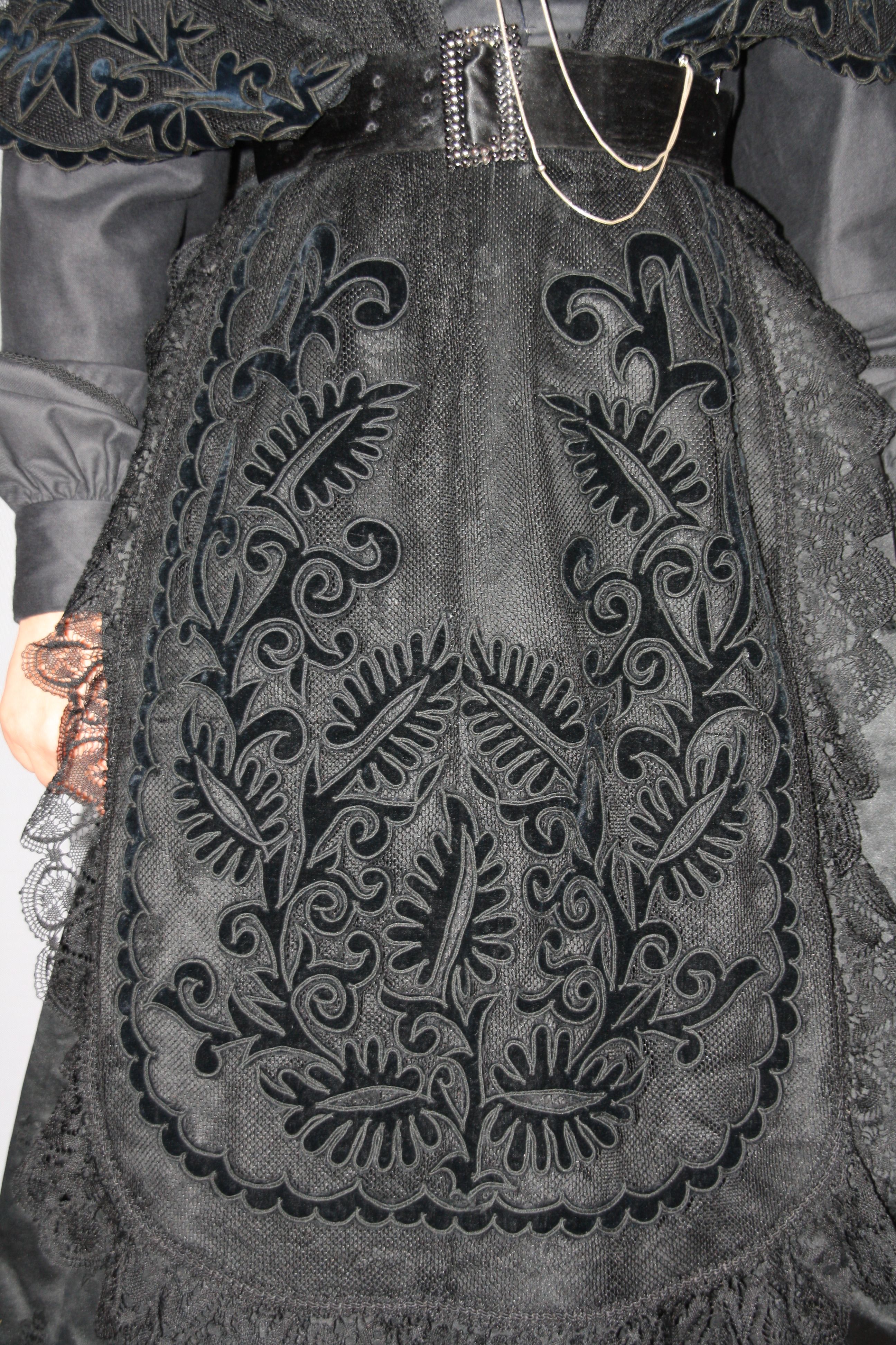 Oui, la Grande Guerre est finie, et la vie sous tous ses aspects reprend... Et comme le promis est de retour, on va célébrer les engagements pris avant le terrible chaos. Nous sommes à Liffré, petite ville au nord de Rennes en cette fin d’année 1919. C’est encore, mais plus pour très longtemps, l’occasion de respecter quelques traditions notamment le dîner des « fiances » réunissant parents, grands-parents, parrain et marraine. On a mis aussi « la bonne vierge dans le persil », ce qui a consisté à mettre la statute de la vierge Marie dans le jardin aux pieds des rosiers, une semaine avant les noces, histoire de s’assurer beau temps. La Grande Guerre a provoqué une formidable émancipation pour la femme et on le voit déjà sur la toilette d’Angèle, la jeune mariée. Plus de caraco baleiné ni de jupe longue qui entrave, plus de châle, plus de devantière, mais seulement une robe plus courte, très souple, en soie noire, rehaussée d’un perlage de jais. Reste la coiffe, le « Papillon ». C’est en fait la « Catiole » qui a diminué et qui disparaît sous la couronne de fleurs d’oranger assortie à la livrée. Pour Mantine, sa mère, pas question de souscrire à cette mode récente de la ville. Elle arbore une superbe parure, châle et tablier assortis, à motifs de velours découpés et rebrodés sur du tulle. La coiffe s’appelle « Polka » ou « Marie-Louise », spécifique du Coglès, du Vendelais et d’autres terroirs rennais. Les hommes se ressemblent tous dans leur costume trois pièces.