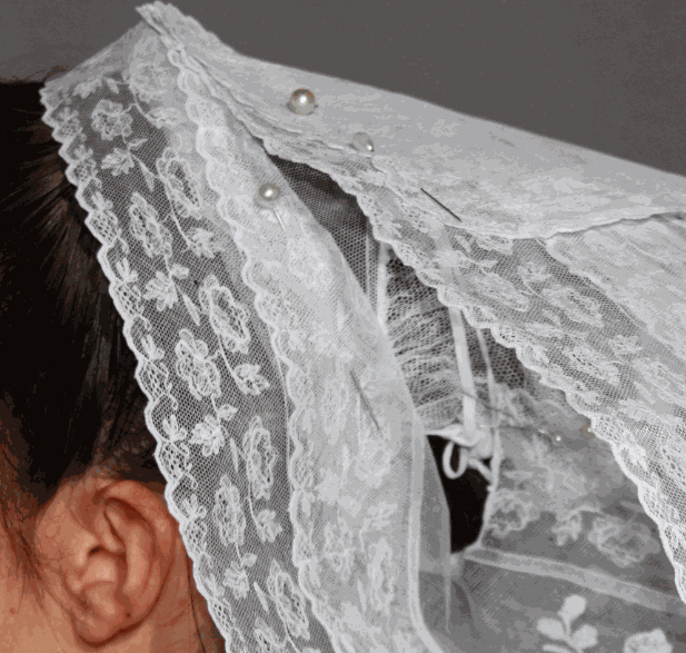 Les deux femmes ont plié leur châle de la même façon. Quatre plis sont attachés dans le dos par une broche et trois sont ramenés sur la poitrine et maintenus attachés au niveau de la ceinture par le tablier. La mariée n’a pas encore adopté la mode du pliage façon col châle qui commence à apparaître à cette époque et qui se répandra dans tout le Trégor. Photo François Le Gal