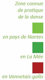 NB : Les communes au sud-est de la Vilaine (communes de Loire-Atlantique comme Saint-Nicolas-de-Redon, Massérac, Guémené-Penfao, Conquereuil, etc.) font partie du Pays de Redon et de Vilaine depuis 2002, date de sa création, suite à l’application de la LOADDT dite loi Voynet de 1999. D’un point de vue historique, même si les échanges ont toujours été nombreux avec les secteurs au nord et à l’ouest de la Vilaine, ces communes font partie intégrante du pays nantais. Nous sommes tout d’abord dans l’évêché de Nantes (référence 1789), la mode vestimentaire à partir de la moitié du XIXe est celle partagée par une bonne partie du pays nantais, il est en de même pour la tradition dansée (le branle ne s’est pas maintenu au sud de la Vilaine et a été remplacé par les contredanses, ce n’est pas le cas au nord).